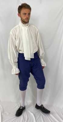 Early 19th century frock coat ensemble for the character Des Grieux in the opera 'Manon Lescaut'. Frock coat and breeches in dark blue moleskin and waistcoat in cream and gold damask and linen with hand stitched buttonholes. Shirt and cravat in white linen with hand made dorset buttons.